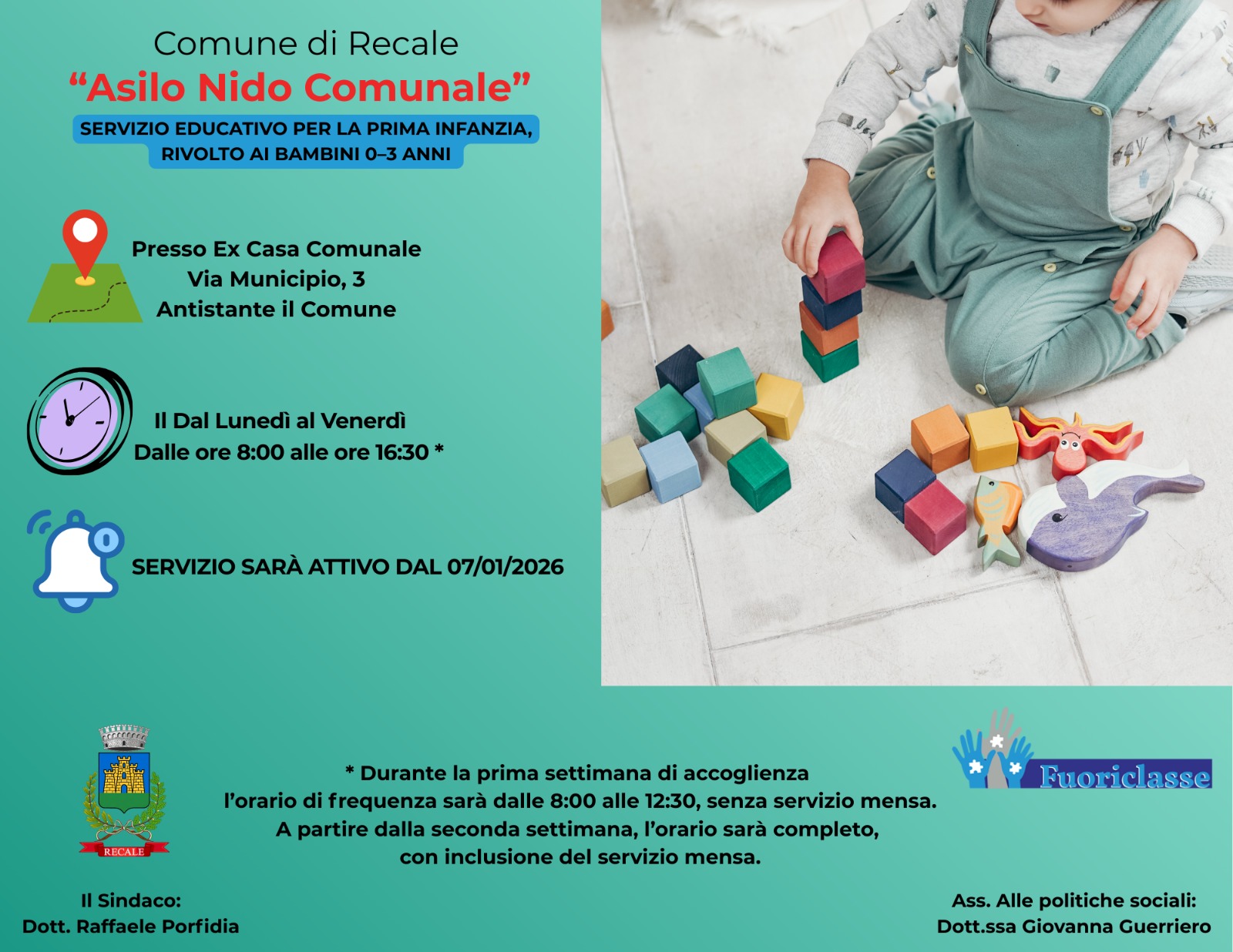 Il Comune di Recale informa i genitori dei bambini regolarmente iscritti al Micro Nido Comunale che il servizio sarà ufficialmente aperto a partire da martedì 7 gennaio 2026.