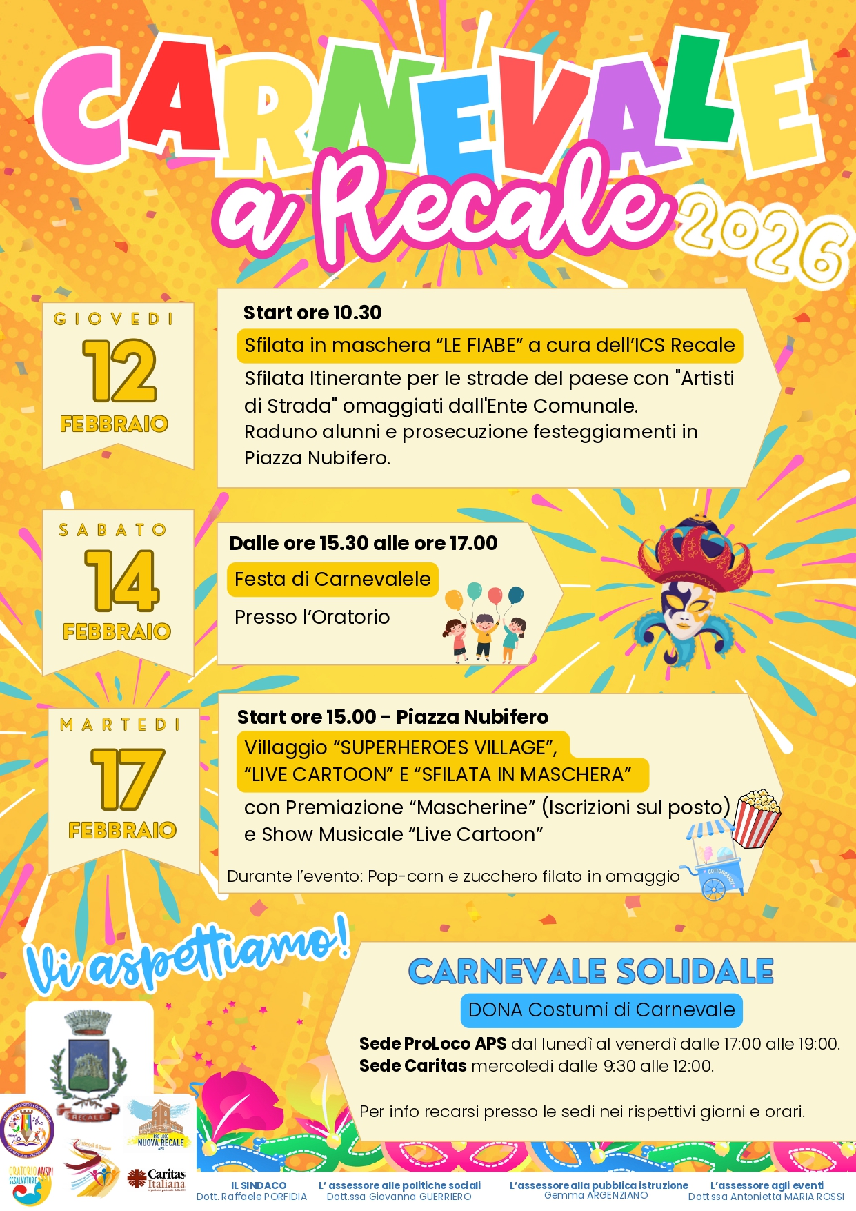 L’Amministrazione comunale invita tutta la cittadinanza a partecipare numerosa per vivere insieme la magia del Carnevale a Recale. 🎭